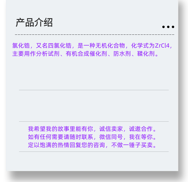 中文名氯化锆外文名zirconium tetrachloride别 名四氯化锆化学式ZrCl4